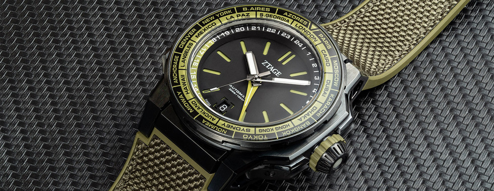 而為進一步提升腕表的實用功能,表盤以三文治式設計,底部綴以瑞士Super-LumiNova夜光外,表圈上的字圈也特別以藍寶石製,以透視底下同樣帶夜光的城市名稱。所以,就算腕表在陰暗環境依然可提供清晰的報時功能。顏色上,黑殼襯綠色表帶是Amazonia亞馬遜版,以淺啡色表盤和表帶襯黑殼則是Savanna草原版,兩款表均格限量300枚,搭載改良自瑞士Soprod的Cal. 1100自動機芯,約售1,980瑞郎。
